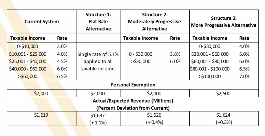 A flat rate of 5.1 percent applied to all taxable income generates $1.637 billion a year in state revenues, up about 1.1 percent from current, according to Deskins.