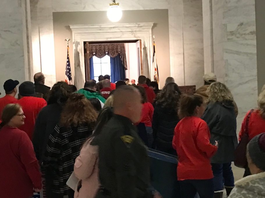 CHARLESTON, W.Va. — Teachers from several West Virginia counties flooded into the state Capitol today to rally for a larger pay raise than the 1 percent proposed by Governor Jim Justice and to push for changes to the Public Employees Insurance Agency healthcare package.