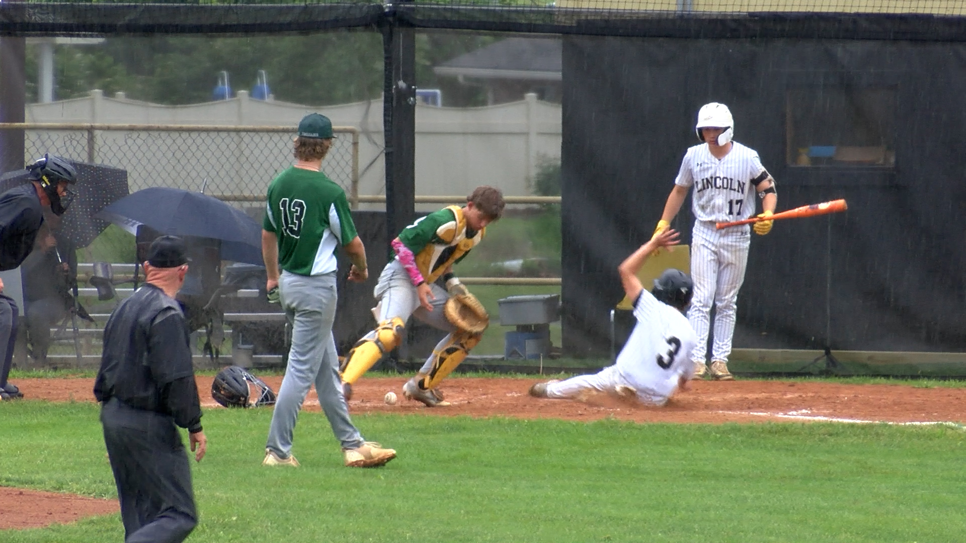 With the game played in a steady rain on the opening day of the WVSSAC high school baseball playoffs, three Lincoln pitchers combined to hold the Trojans (9-16) to just five hits. Starting pitcher AJ Bart retired ten batters before giving way to Gavin Owens. Owens pitched 2.1 innings in relief. Alex Greene retired the side in order in the seventh to secure the victory for Lincoln (17-14).