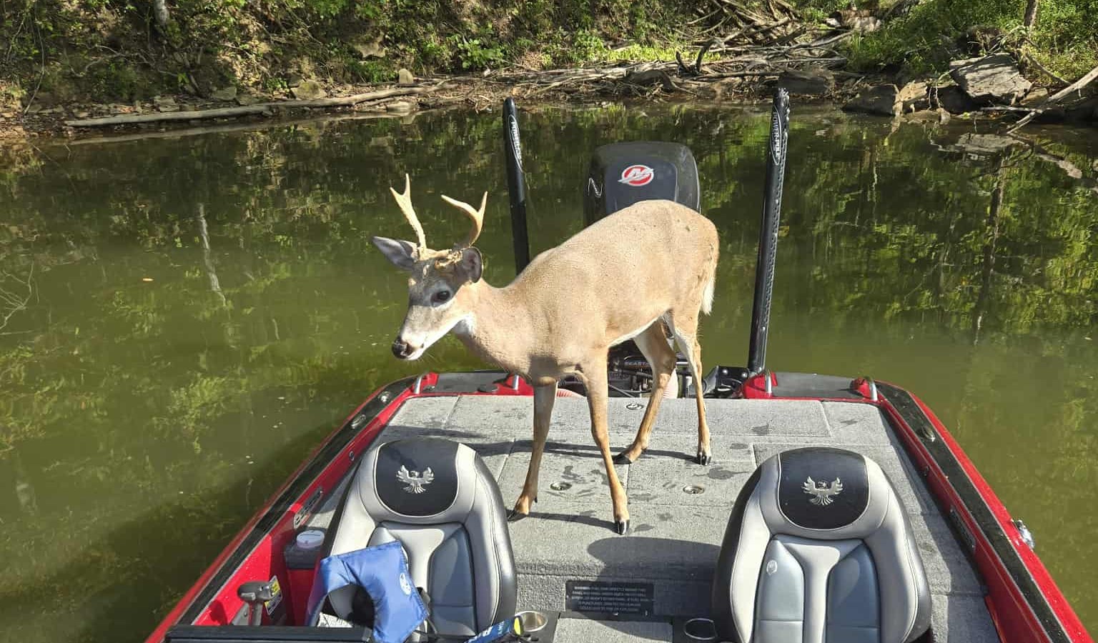 “I think he was probably wanting snacks or something and I wasn’t going to give him anything. Then he started butting me with his head and I wasn’t having that. He had those antlers and I didn’t want to get knocked in the water or get my rods broken,” he said.