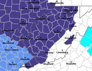 The warning includes the entire western half of the state from the southern coalfields to Morgantown.
